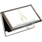 The Mesothelioma Ribbon proudly displayed on a business card holder. There is no better way to achieve remembrance and awareness for the meaning of the Mesothelioma Ribbon than to display it on your business card holder for everyone to see. This sleek and modern card case is perfect to store business cards and/or credit cards. The convenient pocket size business card holder cover features the Mesothelioma Ribbon on a white background framed in executive stainless steel. The back of the cardholde